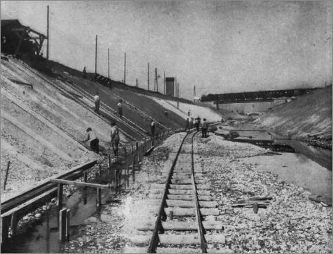 Während die Bauarbeiter gerade die Böschung betonieren, passiert ein Lokalzug der Ismaninger Strecke die Kanalbrücke. Im Vordergrund die Feldbahngleise, ca. 1924. Foto: Archiv E.ON Energie